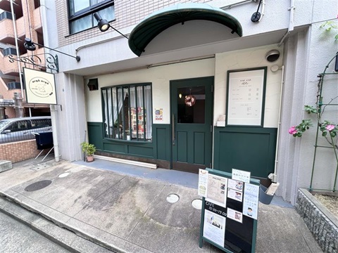 うさぎの看板イラストがかわいらしい、緑色のアンティークな外観が目印です。