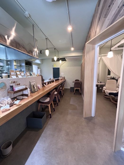 右の部屋がマッサージの施術室、左側がカフェスペースになっています。