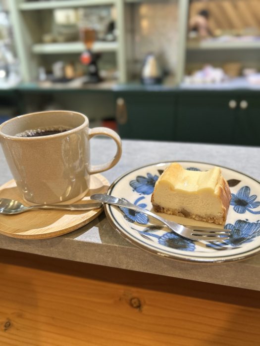 日替わりのケーキはこの日はチーズケーキでした。しっとり滑らかな口当たりと米粉のクッキー生地に入っているくるみのほのかな苦みが、ブレンドコーヒーと相性抜群です♪