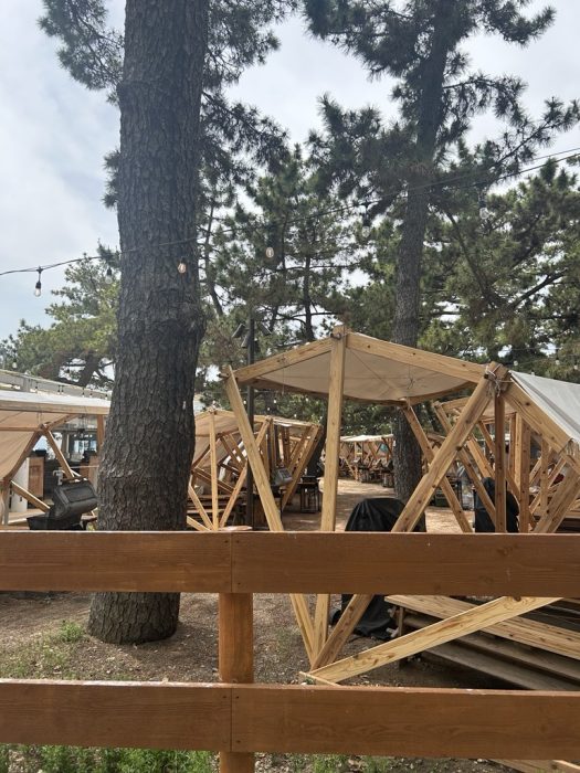 270席を誇る広大なエリアに、グランピングを思わせるおしゃれな木製テントやソファ等が配置され、須磨海浜公園が、西海岸のおしゃれな街のように生まれ変わっていました。
