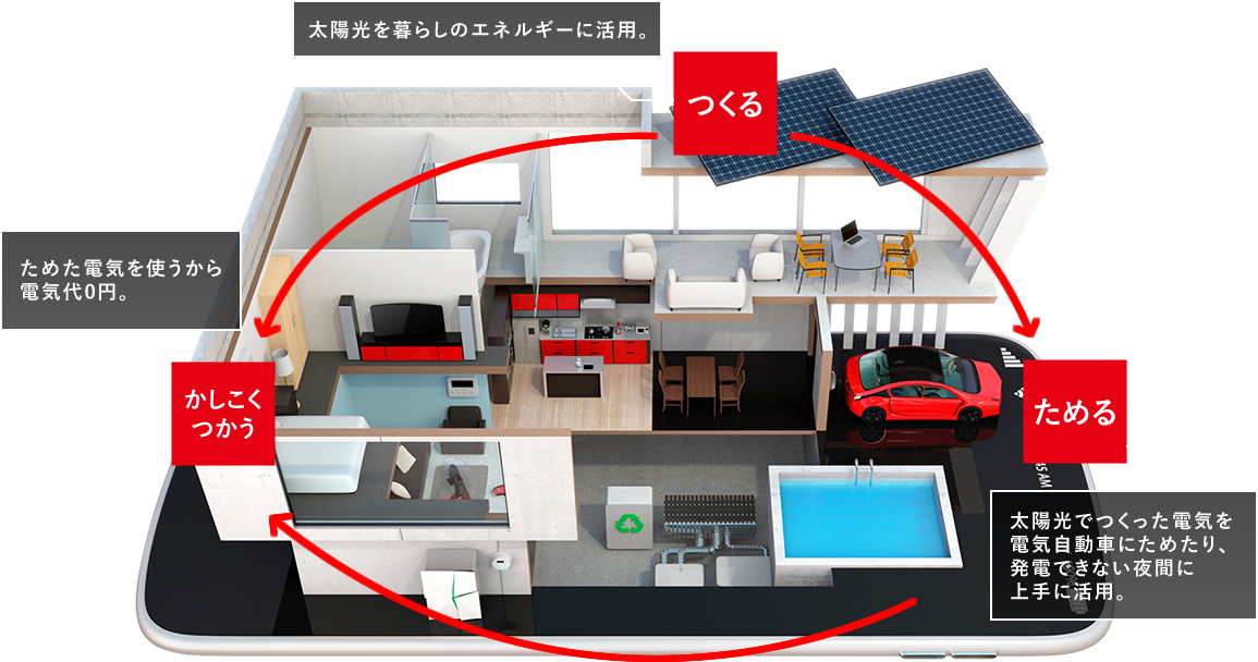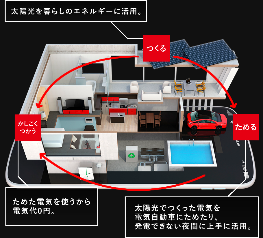 「つくる」「ためる」「つかう」がめぐる、新しいカタチのスマートハウスです。