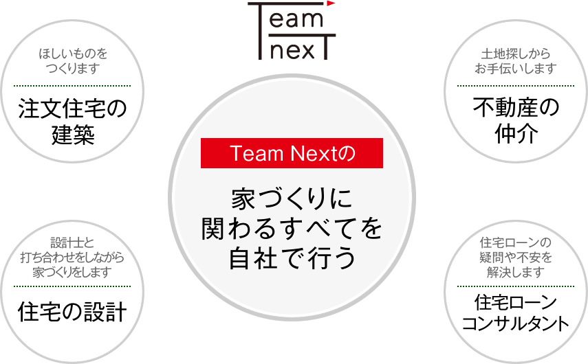私たちTeam Nextは、お客さまの予算に合わせて希望を実現できる、注文住宅をご提供いたします。また、長く住める家こそ価値のある家、注文住宅で建てる意味があると考えています。