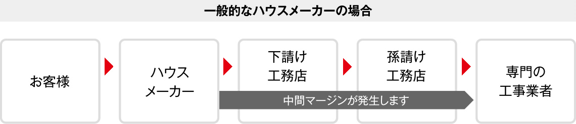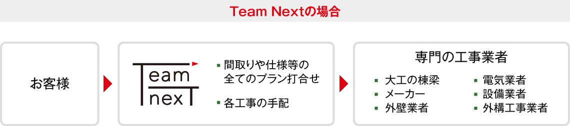 Team Nextが各工事を専門業者へ手配するため中間コストを省くことができる。
