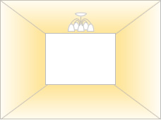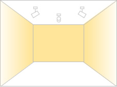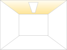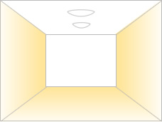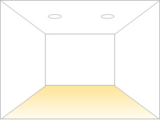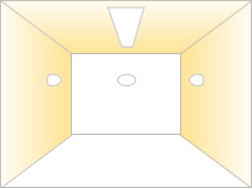 空間を構成する面は天井面、壁面、床面の3つですが、どの壁を照らすかによって空間の印象や明るさ感が大きく変わります。