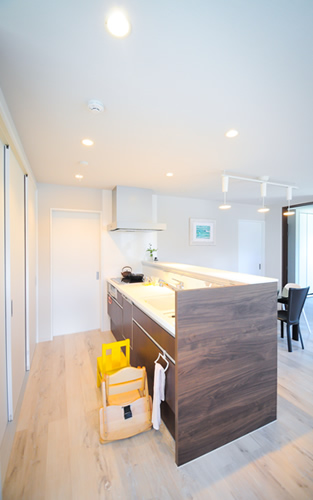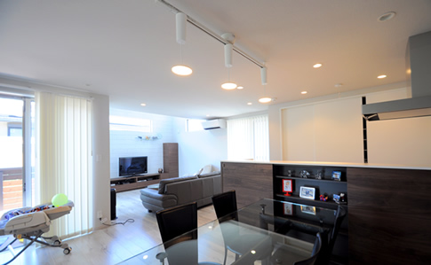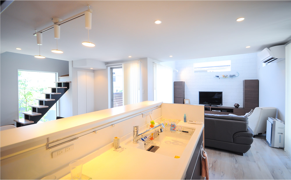 子どもが3人もいると、どうしても物が多くなりがちですが、大きめの収納を設けていただいたことですっきりとした住空間になりました。特にキッチンや水回り部分を広く取り、大きな収納をつくったことで、家事動線に優れた間取りになったと思います。これは、間取りを考える際に、設計士さんからご提案いただきました。また、採光性に関しても配慮していただきました。北向きで傾斜のあるこの土地を、どうすれば陽光あふれる住まいにするかについて綿密に打ち合わせいただいたおかげで、陽当りに優れた、気持ちのよい暮らしができています。