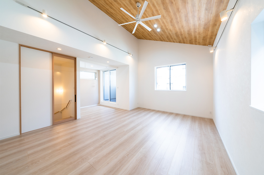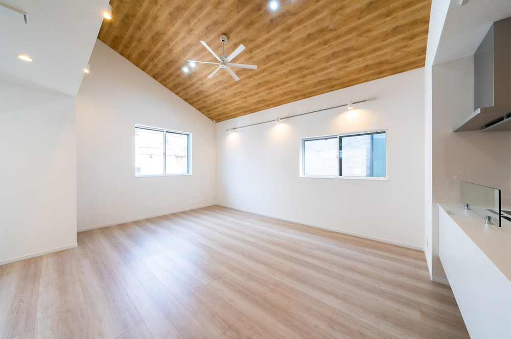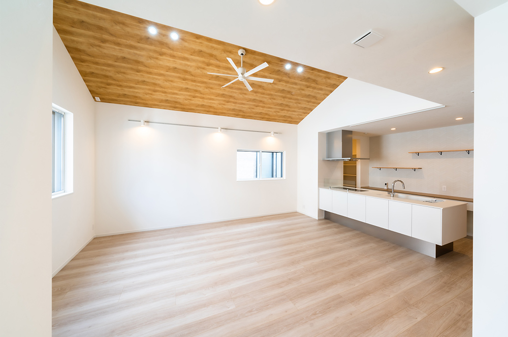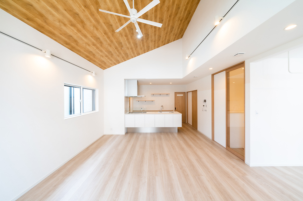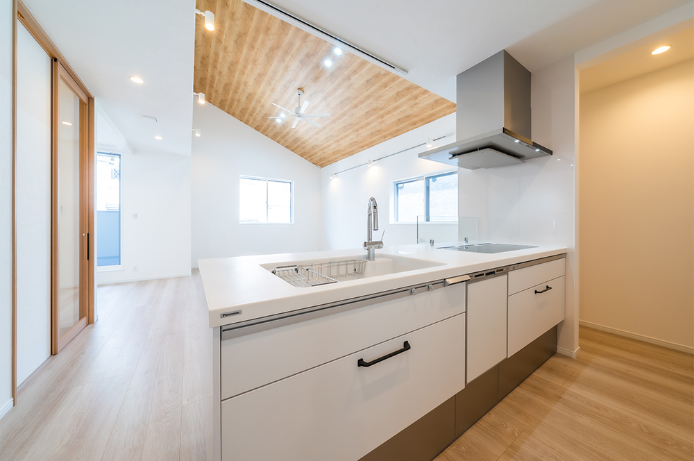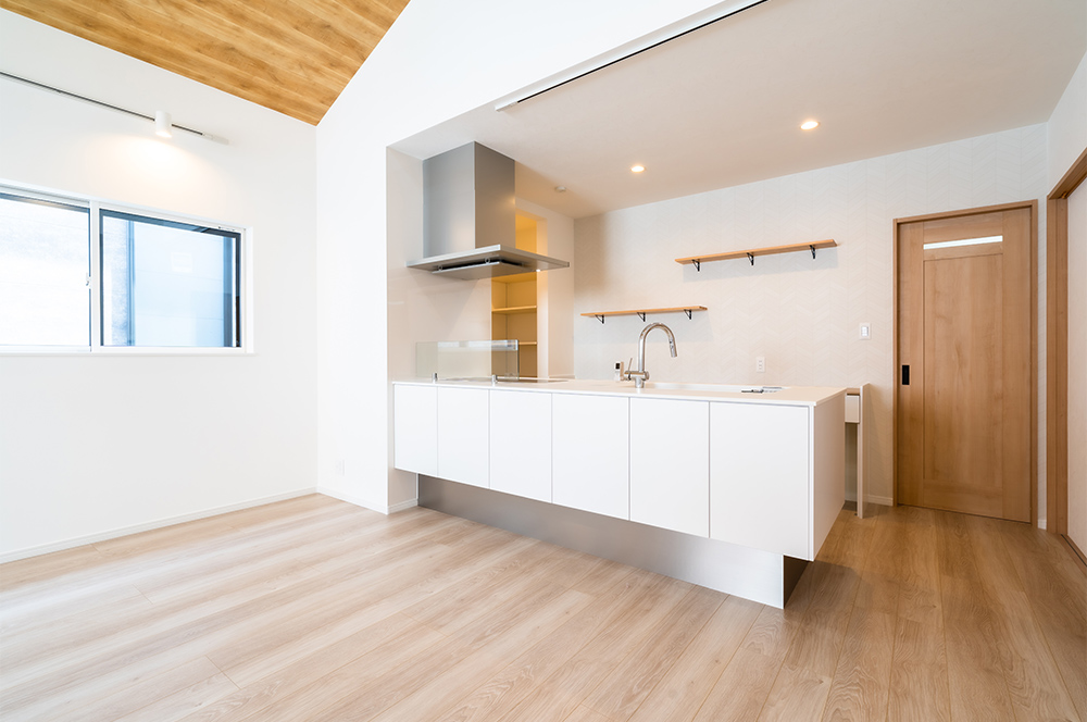 春には満開の桜が咲き並ぶ、桜通りに面した茨木市東奈良の一角。アイボリーのフラットな壁面に、ナチュラルテイストの木目が自然な優しさを演出する1邸。バルコニーの木目と同じく、天然木の風合いが温かな玄関扉を抜けると、大容量のシューズクロークがあり、開口部も大きいのでベビーカーや大きなゴルフバッグなどが、ラクラクすっきりと収納することができます。家族憩いのLDKは、2階にあるため採光性も優れており、特に目を引く大きな勾配天井が、吹抜けのような開放感を出しつつ、視覚的にメリハリを与えてくれます。内観はホワイトのクロスに明るめの木目でアクセントをつけています。LDKだけでなく、ランドリーやバスルームといった水廻りもデザインを統一。どの生活空間も爽やかで明るい雰囲気に仕上がっています。