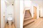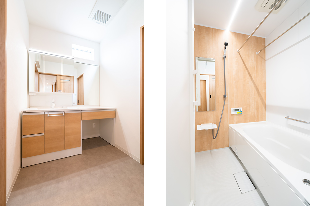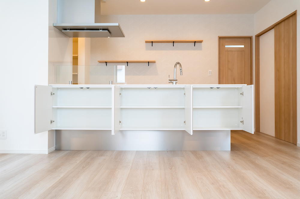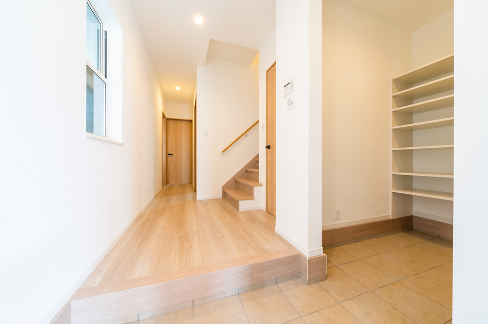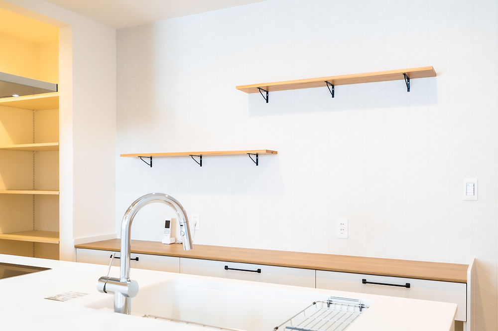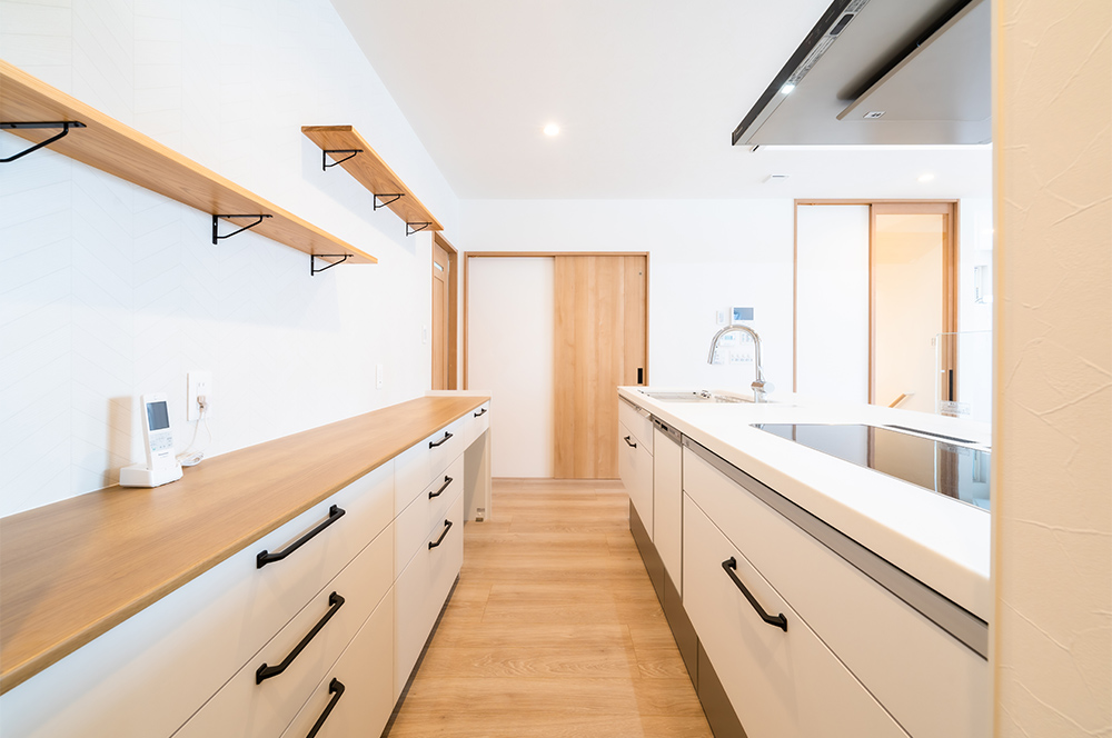 春には満開の桜が咲き並ぶ、桜通りに面した茨木市東奈良の一角。アイボリーのフラットな壁面に、ナチュラルテイストの木目が自然な優しさを演出する1邸。バルコニーの木目と同じく、天然木の風合いが温かな玄関扉を抜けると、大容量のシューズクロークがあり、開口部も大きいのでベビーカーや大きなゴルフバッグなどが、ラクラクすっきりと収納することができます。家族憩いのLDKは、2階にあるため採光性も優れており、特に目を引く大きな勾配天井が、吹抜けのような開放感を出しつつ、視覚的にメリハリを与えてくれます。内観はホワイトのクロスに明るめの木目でアクセントをつけています。LDKだけでなく、ランドリーやバスルームといった水廻りもデザインを統一。どの生活空間も爽やかで明るい雰囲気に仕上がっています。