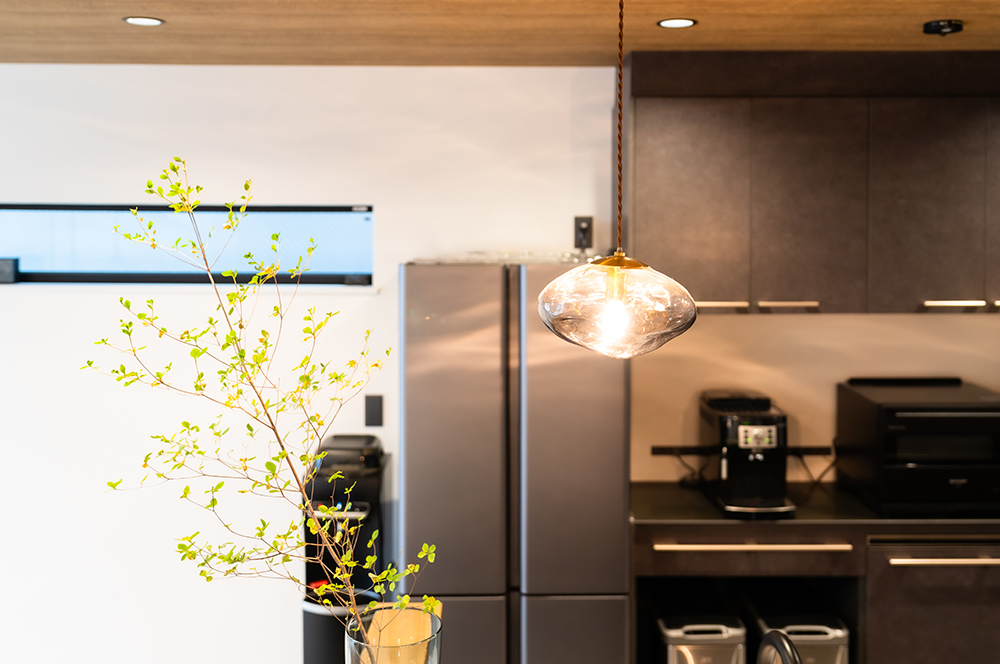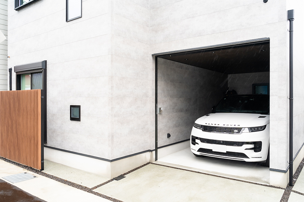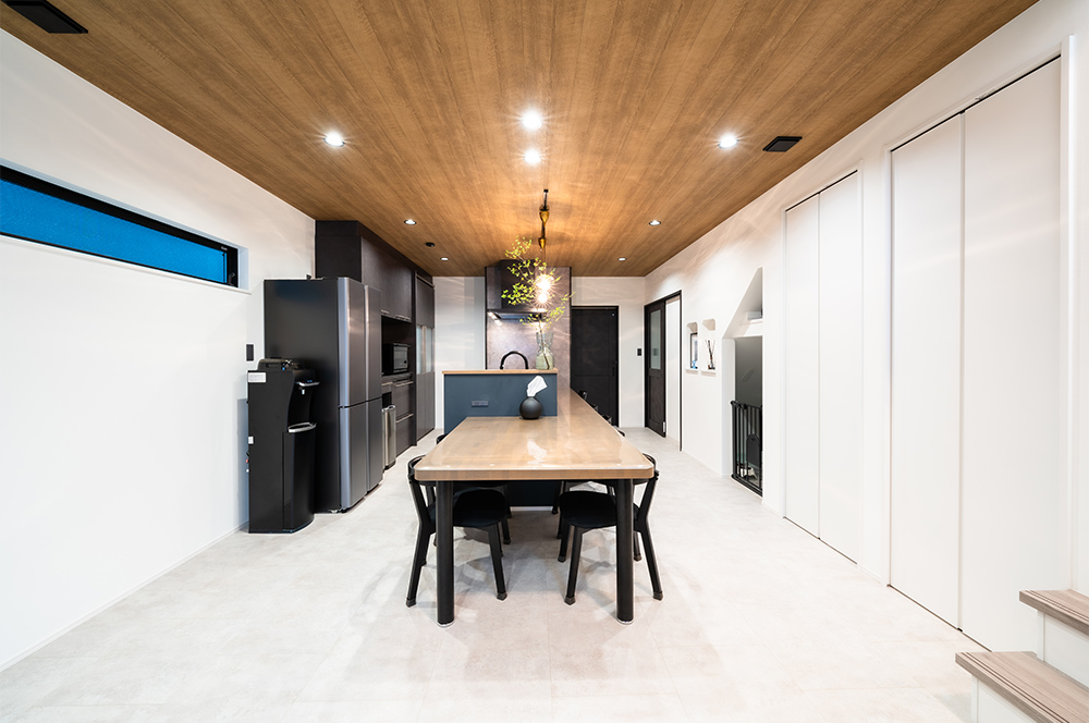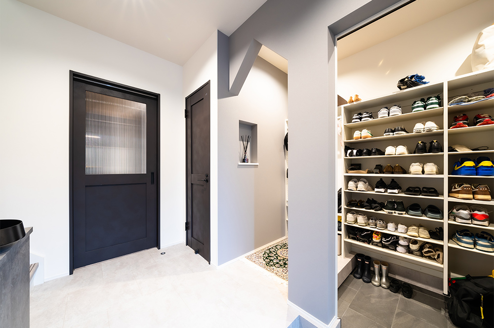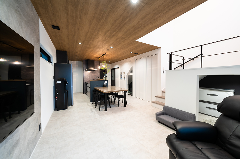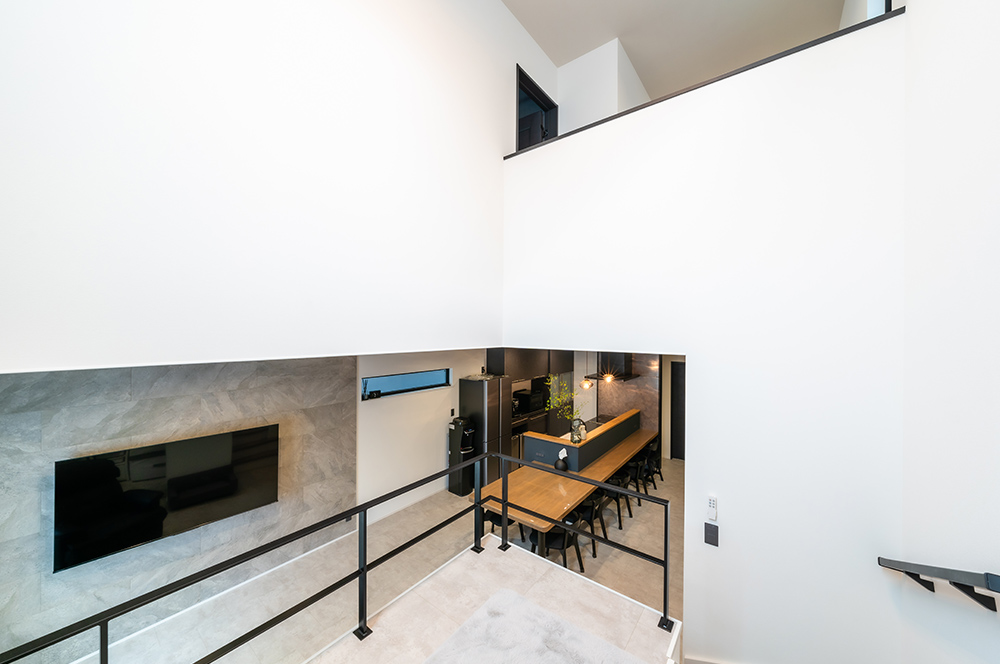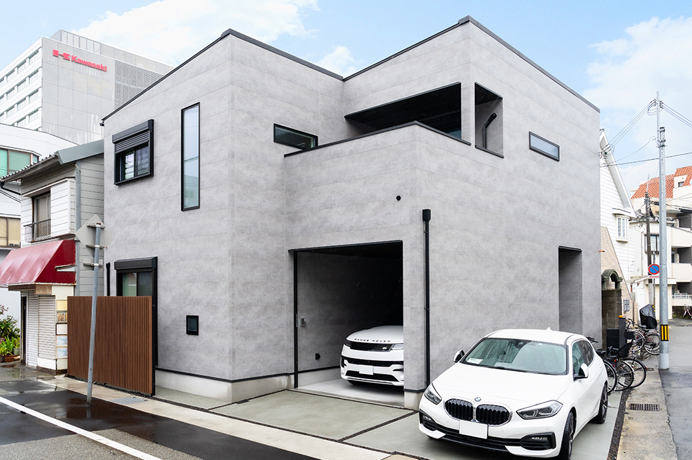 吹き抜けの開放感ある空間が目を引くこの住まいは、本来2区画分であった土地を1区画にあわせて建築されました。ご夫婦とお子様3名というご家族構成を踏まえて、玄関・シューズクロークからリビング、水回りまでスムーズに生活しやすい広めの導線を確保。加えて、玄関から駐車場に通じるドアを設けるなど、ご家族の生活スタイルに合わせた間取り設計を重視しています。広い空間を活かしたリビングには、木目とホワイトを基調に、こだわりの家具が映える内観デザインに。さらに外観は、直線的なフォルムと無駄のないミニマルなデザインが美しく、まさに神戸の都心に佇むに相応しい邸です。