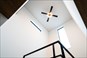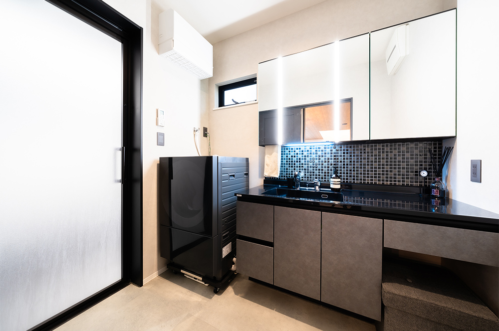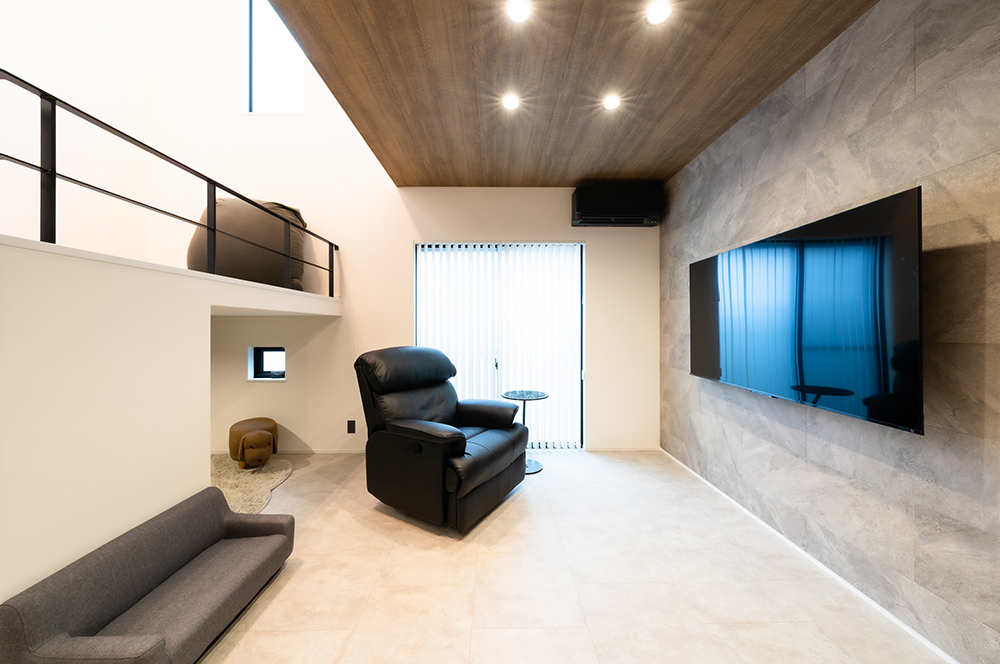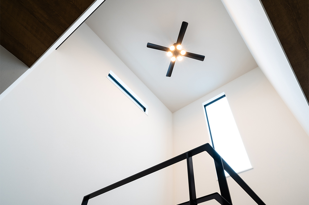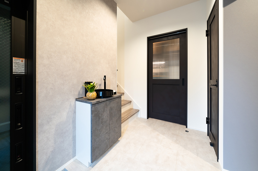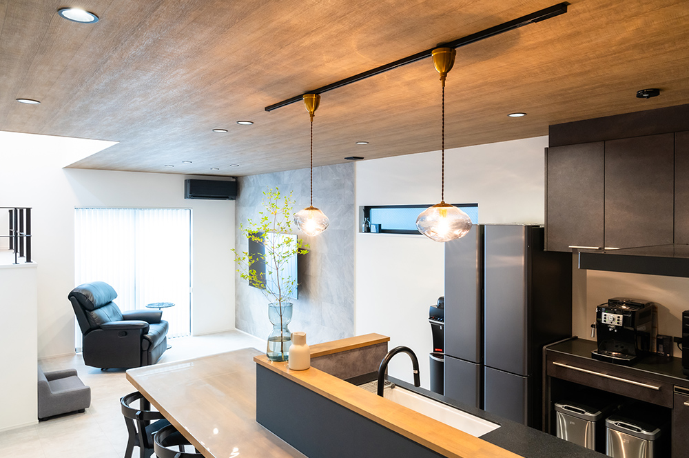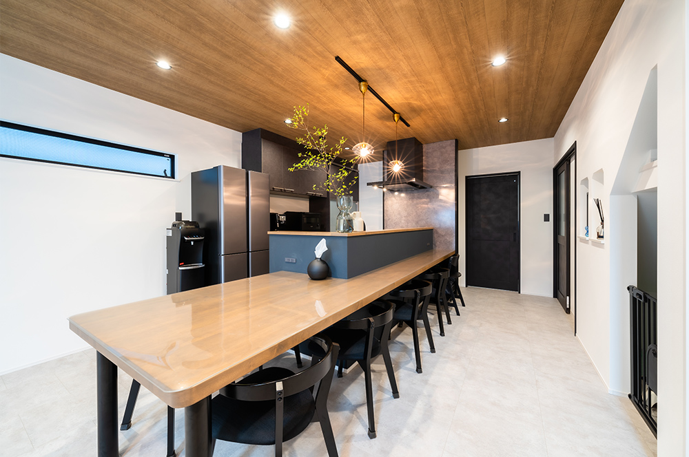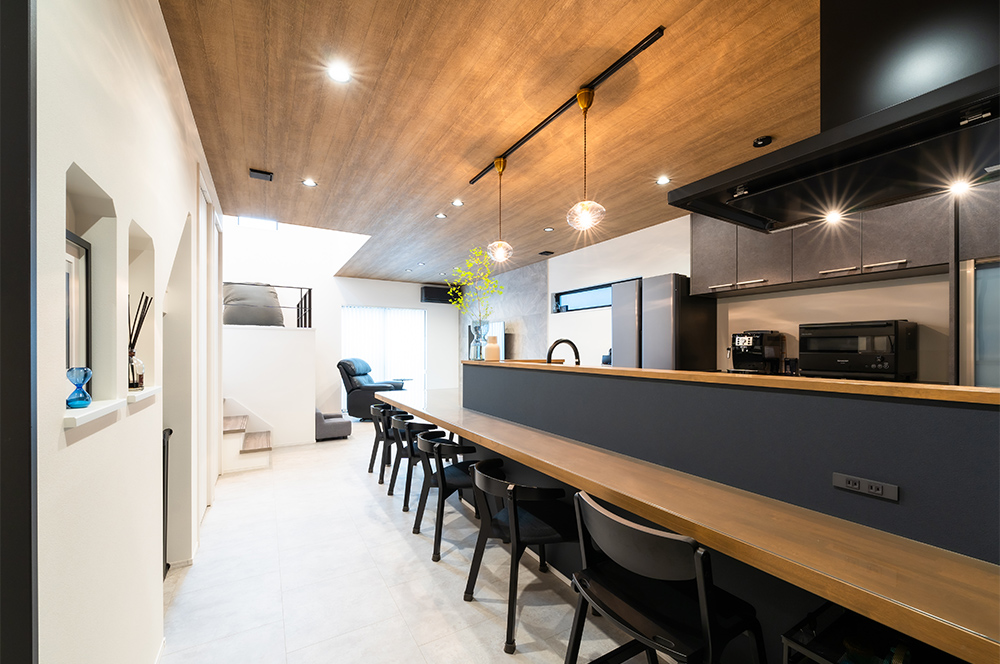 吹き抜けの開放感ある空間が目を引くこの住まいは、本来2区画分であった土地を1区画にあわせて建築されました。ご夫婦とお子様3名というご家族構成を踏まえて、玄関・シューズクロークからリビング、水回りまでスムーズに生活しやすい広めの導線を確保。加えて、玄関から駐車場に通じるドアを設けるなど、ご家族の生活スタイルに合わせた間取り設計を重視しています。広い空間を活かしたリビングには、木目とホワイトを基調に、こだわりの家具が映える内観デザインに。さらに外観は、直線的なフォルムと無駄のないミニマルなデザインが美しく、まさに神戸の都心に佇むに相応しい邸です。